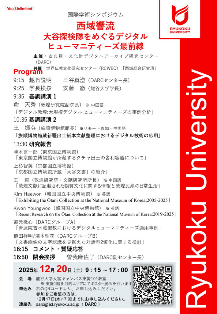 敦煌研究院から1名、旅順博物館から1名、基調講演をいただきます他、国内外の研究者による研究報告も行われます。皆様、奮ってご参加ください。